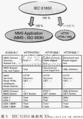 IEC 61850標(biāo)準(zhǔn)中暫時只規(guī)定了映射到MMS,但同時指出了映射到其他可能性,比如XML。XML作為一種異構(gòu)的處理技術(shù),它可以與HTTP的服務(wù)相結(jié)合。如圖6所示。