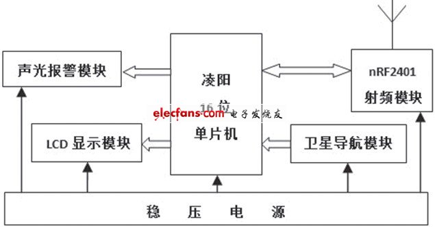 本系統(tǒng)設(shè)計包括單片機(jī)控制模塊、射頻通信模塊、衛(wèi)星導(dǎo)航模塊、液晶顯示模塊、聲光報警模塊和穩(wěn)壓電源模塊。系統(tǒng)采用LM1575芯片將車載12V電源轉(zhuǎn)換為5V電源,以凌陽SPCE061A型16位單片機(jī)為控制中心,使用nRF2401無線射頻收發(fā)模塊實現(xiàn)數(shù)據(jù)的發(fā)送和接收,使用OTrack-32北斗/GPS/GLONASS多模兼容導(dǎo)航芯片模塊實現(xiàn)經(jīng)緯度坐標(biāo)的獲取,同時使用12864型LCD顯示模塊實時顯示車距檢測信息,并使用蜂鳴器和LED實現(xiàn)聲光報警。系統(tǒng)框圖如圖1所示。