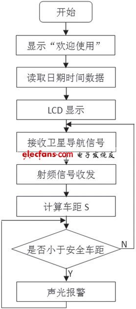 系統(tǒng)工作時,首先進(jìn)行系統(tǒng)自檢和初始化設(shè)置,并通過LCD模塊顯示“歡迎使用”界面。然后通過衛(wèi)星導(dǎo)航模塊接收經(jīng)緯度信息并輸入到單片機,單片機通過控制射頻收發(fā)模塊,采用nRF2401模塊的通道1發(fā)送經(jīng)緯度信息,同時采用通道2接收周圍的經(jīng)緯度信息,并將接收到的周圍車輛的經(jīng)緯度信息輸入到單片機進(jìn)行處理。