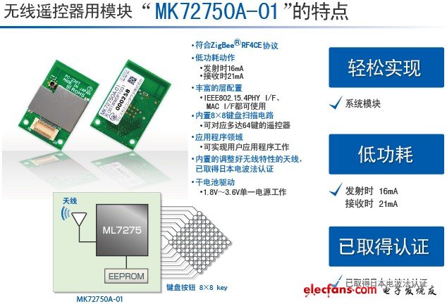 LAPIS Semiconductor是羅姆集團旗下的公司,它開發(fā)出了2.4GHz無線通信模塊“MK72750A-01”,此模塊符合“ZigBee?RF4CE”協(xié)議,并且可通過內(nèi)置的調(diào)整好無線特性的天線立即發(fā)射電波。另外,此模塊作為無線通信LSI,由于內(nèi)置了本公司生產(chǎn)的“ML7275”,因此僅此模塊可以實現(xiàn)ML7275著稱的低功耗且符合RF4CE規(guī)范的無線遙控器功能。本產(chǎn)品內(nèi)置調(diào)整好無線特性的天線,已取得日本國內(nèi)電波法認證,所以,無線技術(shù)開發(fā)經(jīng)驗較少的客戶也可開始輕松開發(fā)。在日本國內(nèi),可以立即發(fā)射電波進行評價、開發(fā),因而開發(fā)周期亦可大大縮短。另外,使用了本公司設(shè)計的無線通信LSI,LSI相關(guān)事項可提供迅速、精準(zhǔn)的技術(shù)支持。