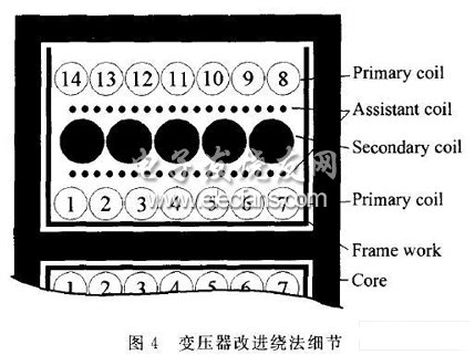 本文討論的電路中還存在前級(jí)電路和次級(jí)電路的輔助電源,它們也是由繞在變壓器上的獨(dú)立線圈提供能量的。這兩級(jí)輔助線圈的存在給噪聲電流的傳播提供了額外的途徑。輔助線圈是為了控制電路的供電設(shè)計(jì)的。盡管控制電路本身的功率很小,但它們的存在卻增大了電路對(duì)地的寄生電容,從而分擔(dān)了一部分把共模噪聲從活躍節(jié)點(diǎn)耦合到地的工作。然而把這些繞組夾在前級(jí)線圈和次級(jí)線圈的繞組中間就能增大前后級(jí)繞組的距離,從而它們的層間寄生電容就減小了,噪聲電流就能相應(yīng)減小。因此,變壓器繞制的最終方法應(yīng)如圖4所示。從內(nèi)到外的線圈繞組依次是:前級(jí)繞組的一半、輔助繞組的一半、后級(jí)繞組、輔助繞組的另一半和前級(jí)繞組的另一半。