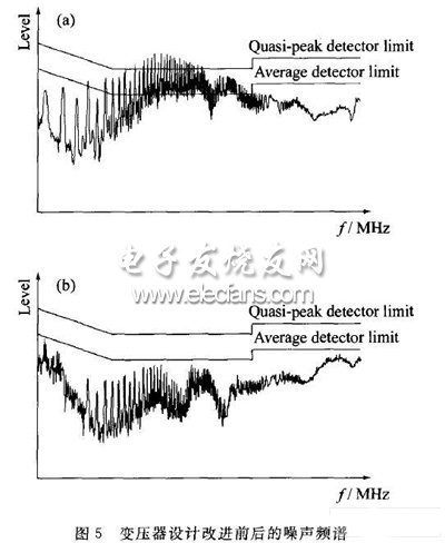 圖5為變壓器設(shè)計(jì)改進(jìn)前后實(shí)驗(yàn)樣品的傳導(dǎo)噪聲頻譜對(duì)比。