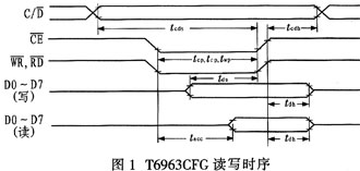 ??? LCD接口控制信號(hào)的讀寫時(shí)序如圖1所示。各控制信號(hào)的時(shí)序可由微控制器的通用輸入輸出(GPIO)接口仿真實(shí)現(xiàn),例如:C/D為高電平,CE為低電平,WR為高電平以及RD為低電平時(shí),可以從數(shù)據(jù)線上(D0~D7)讀取T6963CFG的狀態(tài)字。