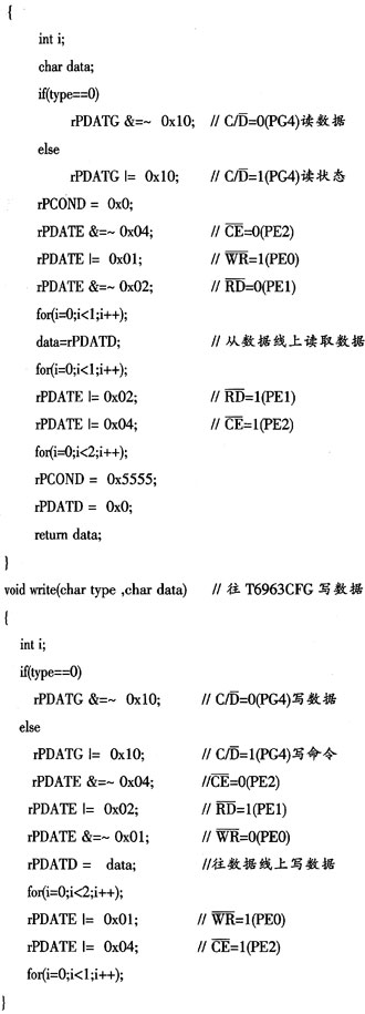 ??? 根據(jù)T6963CFG的讀寫時(shí)序和相應(yīng)的電路配接,讀寫操作的函數(shù)為: