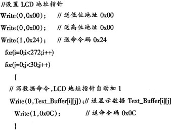 ??? 系統(tǒng)內(nèi)存文本緩沖區(qū)與LCD文本顯示緩沖區(qū)有著映射關(guān)系.其數(shù)據(jù)格式是按屏幕格式大小設(shè)定的。例如:一行30個(gè)字符對(duì)應(yīng)著內(nèi)存連續(xù)的30個(gè)字節(jié)。一屏(頁(yè))16行對(duì)應(yīng)內(nèi)存連續(xù)的480字節(jié)。如果內(nèi)存文本緩沖區(qū)為8 KB,可映射17頁(yè)(共272行),其緩沖區(qū)設(shè)置為:Text_Buffer[272][30](行列二維數(shù)組),內(nèi)存文本緩沖區(qū)中的數(shù)據(jù)傳送到LCD文本緩沖區(qū)的過程可以通過下面的代碼實(shí)現(xiàn):