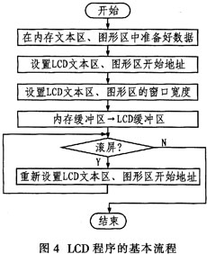 ??? 在對(duì)HS240128編程時(shí),首先在內(nèi)存顯示緩沖區(qū)中準(zhǔn)備好數(shù)據(jù),并把數(shù)據(jù)寫入LCD緩沖區(qū),LCD自動(dòng)實(shí)現(xiàn)掃描顯示功能。要實(shí)現(xiàn)屏幕滾動(dòng)功能時(shí),只要簡(jiǎn)單的修改LCD文本區(qū)和圖形區(qū)的起始地址即可。其基本流程如圖4所示。