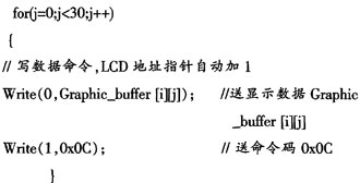 ??? 例如:一行240個(gè)點(diǎn)對(duì)應(yīng)著內(nèi)存連續(xù)的30個(gè)字節(jié)。一屏(頁(yè))128行,對(duì)應(yīng)內(nèi)存連續(xù)的3 840字節(jié)。設(shè)置內(nèi)存圖形緩沖區(qū)為16 kB,映射LCD屏4頁(yè)(共512行)。內(nèi)存圖形緩沖區(qū)設(shè)置為:Graph-ic_buffer[512][30](行列數(shù)組),則將內(nèi)存圖形緩沖區(qū)中的數(shù)據(jù)傳送到LCD圖形緩沖區(qū)的過程可以通過下面的代碼實(shí)現(xiàn):