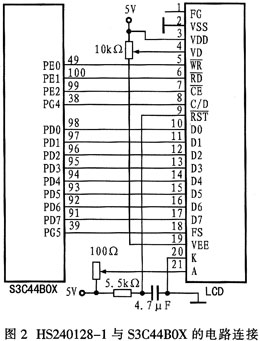 ??? 通常LCD產(chǎn)品都具有相應(yīng)的硬件接口電路,但其類型不盡相同。帶自掃描電路,可提供文本、圖形和圖文混合顯示功能的LCD可以方便地與市場(chǎng)提供的嵌入式微控制器或單片機(jī)相連,如Phlips公司的LPC2104、2119等。S3C44B0X是Samsung公司提供的高性價(jià)比嵌入式片上系統(tǒng)解決方案,采用ARM7TDMI內(nèi)核,片上集成了豐富的外圍元件,特別適用于對(duì)成本和功耗敏感的應(yīng)用。S3C44BOX雖然集成有LCD控制邏輯,但是,HS240128顯示器的控制接口內(nèi)置了控制電路,利用S3C44BOX豐富的GPIO口資源(71個(gè)),很容易實(shí)現(xiàn)配接。在本系統(tǒng)設(shè)計(jì)中選用PD0~PD7、PE0~PE2、PG4~PG5作為L(zhǎng)CD的控制線和數(shù)據(jù)線。其電路連接如圖2所示。