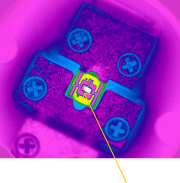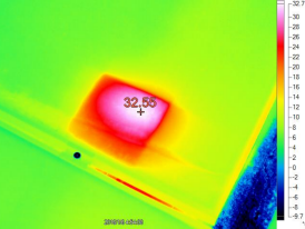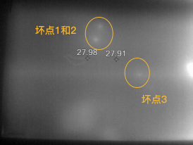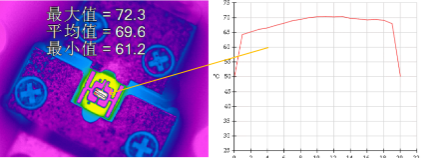 從熱像畫面可清晰看出,芯片的左右側溫度不均勻,研發(fā)人員可以此為依據,改進器件材料和散熱設計。