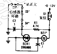 三個開關(guān)串聯(lián)在一起然后接到SCR的控制極是,正常情況下這些開關(guān)處于閉合狀態(tài),當(dāng)其中某開關(guān)被打開時,SCR經(jīng)由RI被觸發(fā),BZ1報警器發(fā)出聲響,該報警器為不間斷型。