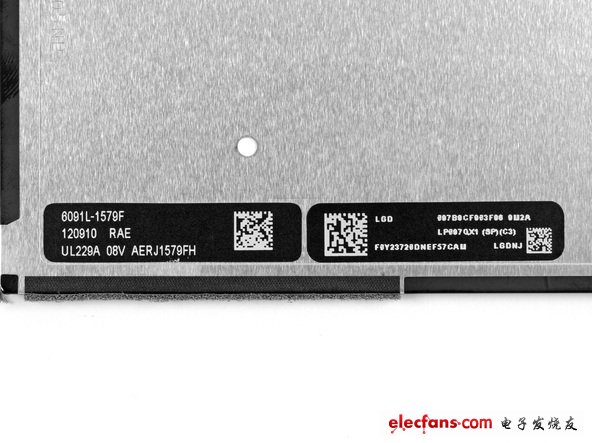 抬起LCD面板,我們最直觀地看到ipad 4的電池,它配置3.7 V, 43 Whr的電池包,和iPad 3一樣,iPad 4的電池也非常牢固地固定在后蓋上。由于電池是消耗品,容易磨損,這給iPad以及其他蘋果設(shè)備的拆解增添難度。