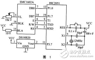 由 圖1可看到,本電路主要由DSl8820溫度傳感器芯片、SMCl602A液晶顯示模塊芯片和89C2051單片機(jī)芯片組成。其中,DSI8B20溫度傳 感器芯片采用“一線制”與單片機(jī)相連,它獨(dú)立地完成溫度測(cè)量以及將溫度測(cè)量結(jié)果送到單片機(jī)的工作。DSl8820的連接引腳圖如圖2所示。