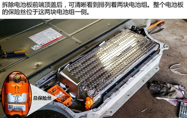 電池組內(nèi)每一節(jié)電池都有保險(xiǎn)絲鏈接著,以防單節(jié)電池過熱危及整體電池過熱,并且每節(jié)電池保險(xiǎn)絲焊接非常精美。電池組中央有線連接到電池控制模塊,這些線用來檢測電池組的電壓,從而保證電池組正常工作。