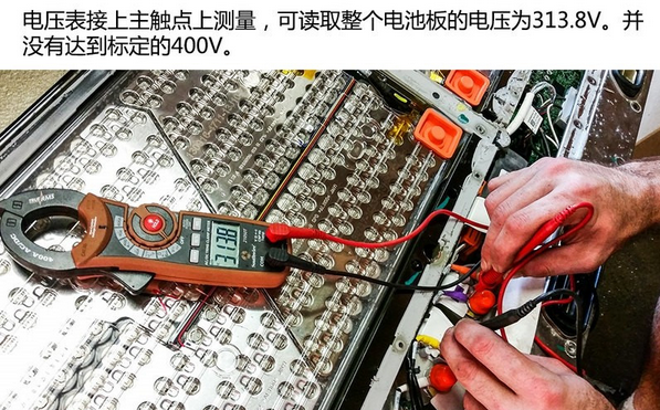 測量了整個(gè)電池板的電壓為313.8V,單體電池組電壓為196.3V。顯然這塊電池并沒有達(dá)到額定的輸出電壓,可能電池電量并不充足所導(dǎo)致。