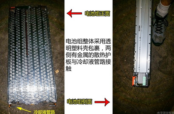 電池組整體由透明塑料殼包裹住,兩側(cè)有金屬散熱護(hù)板包圍。電池厚度比腳掌稍稍厚些,屬于扁長型電池組,從而導(dǎo)致車輛重心可大大降低??傮w電池組保護(hù)的相當(dāng)不錯(cuò)。
