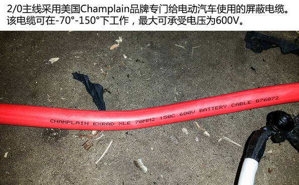 電池板中央有一條2/0主線,每組電池組都通過該主線串聯(lián)輸出電流,因此2/0主線尤其重要。特斯拉采用美國Champlain的專門為電動車生產(chǎn)的線纜,其最高可承受600V電壓,并且可在-70°-150°之間工作。2/0主線保護(hù)的相當(dāng)不錯(cuò),不僅有護(hù)板保護(hù),而且還有防火材料包裹。這一點(diǎn)可猜測其工作時(shí)有可能產(chǎn)生高溫。