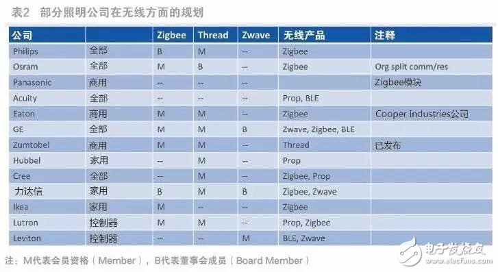 2說明了這些領(lǐng)先聯(lián)網(wǎng)照明廠商在zigbee/Thread聯(lián)盟中扮演的角色,會員(M)在聯(lián)盟中是一般身份,而董事會成員(B)則可以指導(dǎo)聯(lián)盟的發(fā)展方向。在聯(lián)盟中,大家都關(guān)注zigbee、ThreadZwave的發(fā)展方向,后者是美國的一種Sub-GHz協(xié)議,即低于1GHz的私有協(xié)議(注:關(guān)注Zwave主要不是因為照明,而是用于家庭安防)。