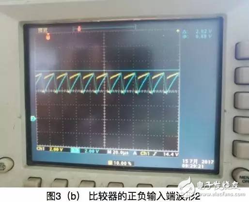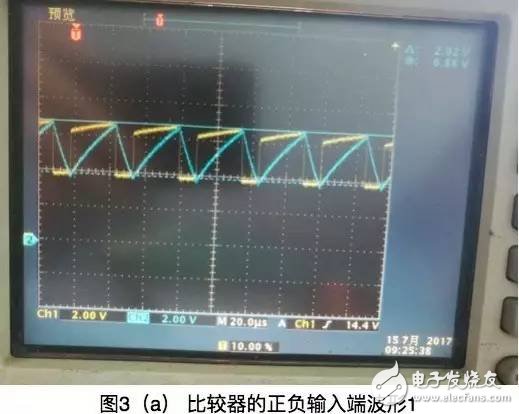 從圖3波形中可以看出,調整R11,可以改變三角波的頻率(黃色的為5腳波形,藍色的為4腳波形),三角波的上升沿大于下降沿時間,當5腳電壓為高時,電容充電,三角波處于上升沿階段;當5腳電壓為低時,電容放電,三角波處于放電階段,這和之前設計時的分析相吻合,達到預期效果。