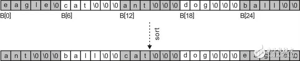 其中,keyWord[0]的類型是char*,&keyWord[0]的類型是char **。雖然這些字符串看起來好像存儲在keyWord指針數(shù)組變量中,但指針數(shù)組變量中實(shí)際上只存儲了指針,每一個(gè)指針都指向其對應(yīng)字符串的第一個(gè)字符。也就是說,第i個(gè)字符串的所有字符存儲在存儲器中的某個(gè)位置,指向它的指針存儲在keyWord [i]中,即keyWord [0]指向“"eagle"”、keyWord [1]指向“"cat"”,keyWord[2]指向 "ant",keyWord[3]指向 "dog",keyWord[4]指向 "ball"。