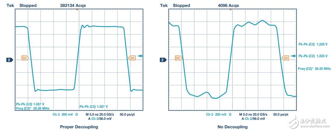 這些實驗表明,除去大多數(shù)或所有去耦電容會導(dǎo)致性能降低,但要分析或預(yù)測除去一兩個去耦電容的影響是很困難的。當拿不定主意時,最佳策略是放上電容。雖然成本略有增加,但消除了性能降低的風險,這樣做通常是值得的。