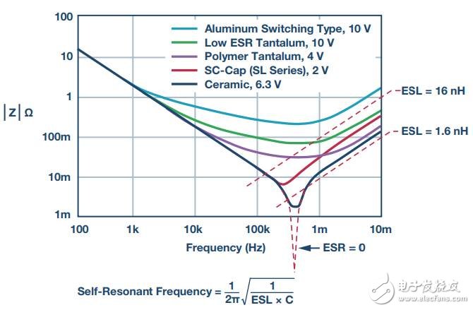 所有電容的阻抗曲線都與圖示的大致形狀類似。雖然實際曲線圖有所不同,但大致形狀相同。最小阻抗由ESR決定,高頻區(qū)域由 ESL決定,而后者在很大程度上受封裝樣式影響。
