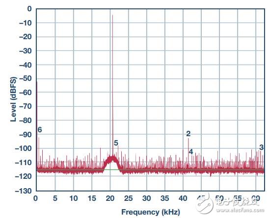 圖6顯示了從模擬電源去除去耦電容后的頻譜。請注意,高頻雜散信號增加了,還出現(xiàn)了一些交調(diào)產(chǎn)物(低頻成分)。信號SNR已顯著降低。本圖與上圖的唯一差異是去除了去耦電容。