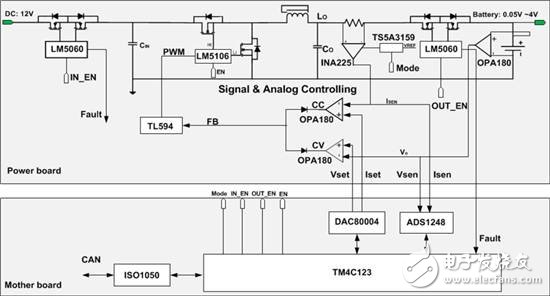 OPA180為自穩(wěn)零,低溫飄運(yùn)放,做PID調(diào)節(jié)和CV, CC控制。外部ADCADS1248是24位D-S ADC, 用于采集充放電的電壓電流,不參與環(huán)路控制。一個(gè)ADS1248可以同時(shí)測(cè)量4路電池充放電的電流電壓,如果加外部開關(guān)切換,可以測(cè)量更多,實(shí)現(xiàn)更好的性價(jià)比。