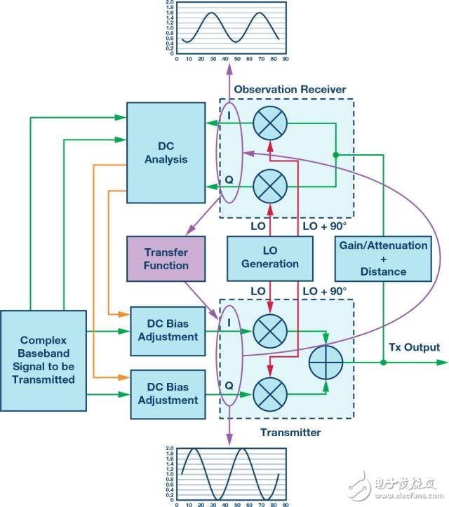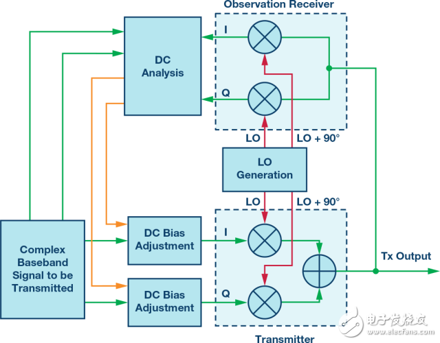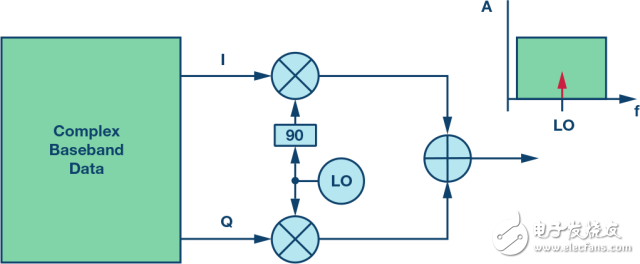 所需的發(fā)射信號將需要應用于發(fā)射器的輸入。對發(fā)射數(shù)據(jù)施加直流偏置后,混頻器的輸出端將包含所需的發(fā)射信號以及所需的LOL抵消信號。特意生成的抵消信號將與無用的LOL組合抵消,僅留下 所需的發(fā)射信號。