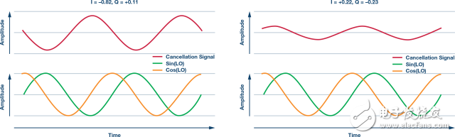 用于驅(qū)動復數(shù)混頻器的正交信號可以描述為Sin(LO)和Cos(LO) —這些是LO頻率的正交信號,可以驅(qū)動兩個混頻器。為了生成抵消信號,這些正交信號以不同的權重相加。就數(shù)學而言,我們可以產(chǎn)生一個輸出,即I × Sin(LO) + Q × Cos(LO)。運用不同的帶符號值代替I和Q,得到的和將是LO頻率信號,并且可以具有任何所需的幅度和相位。示例如圖5所示。