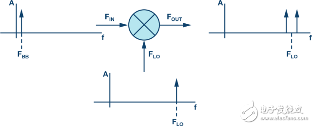 RF混頻器有兩個輸入端口和一個輸出端口,如圖1所示。理想混頻器將產(chǎn)生一個輸出,它是兩個輸入的乘積。就頻率而言,該輸出的頻率應當是FIN+ FLO以及FIN– FLO,不含其它項。如果任一輸入不在驅(qū)動狀態(tài)下,則不會有輸出。