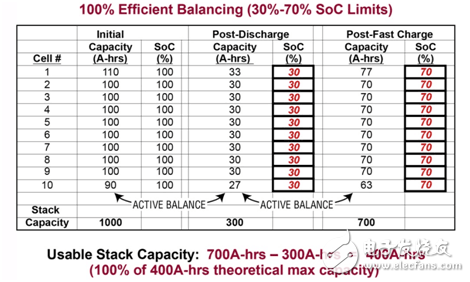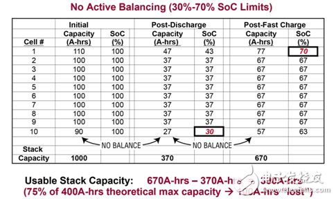 在圖 2 所示的例子中,電池組由10 節(jié)電池串聯(lián)組成,每節(jié)電池的容量均為100A-hr (標(biāo)稱值),容量最小的電池與容量最大的電池之間的容量誤差為 ±10%,對(duì)該電池組充電或放電,直至達(dá)到預(yù)定的 SoC 限制為止。如果 SoC 值限制在 30% 至 70% 之間,而且沒有進(jìn)行容量平衡,那么在一個(gè)完整的充電 / 放電周期之后,相對(duì)于這些電池的理論可用容量,可用電池組容量降低了 25%。在電池組充電階段,無源平衡從理論上可以讓每節(jié)電池的 SoC 相同,但是在放電時(shí),無法防止第 10 節(jié)電池在其他電池之前達(dá)到其 30% 的 SoC 值。即使在電池組充電時(shí)采用無源平衡,在電池組放電時(shí)也會(huì)顯著丟失容量 (容量不可用)。只有有源平衡解決放案才能實(shí)現(xiàn)容量恢復(fù),有源平衡解決方案在電池組放電時(shí)從 SoC 值較高的電池向 SoC 值較低的電池重新分配電荷。