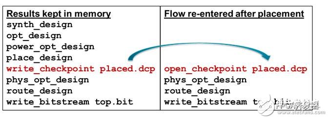 與同等意義的內存內設計流程相比,檢查點應生成可重復性的結果。請考慮以下命令順序,一個運行內存中的整個設計流程,另一個則使用放置的檢查點通過 phys_opt_design 命令再次從內存中的流程進入該流程。