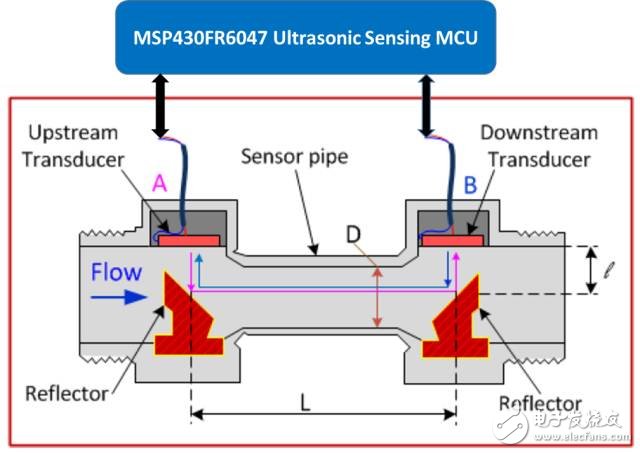 一對超聲波換能器可以直接與MSP430FR6047 MCU集成的超聲波外設(shè)(USS)連接。USS使用高速8MSPS的Σ-Δ ADC可以靈活的對每個(gè)傳感器進(jìn)行獨(dú)立的激勵(lì)和響應(yīng)捕獲。USS再將捕獲的波形采用多種數(shù)字信號處理算法進(jìn)行下一步處理。MSP430FR6047 MCU中采用的波形捕獲技術(shù)和處理方法能夠得到一流的分辨率(<5ps) —— 對住宅和工業(yè)應(yīng)用中的液體和氣體流量檢測是一個(gè)突破性系統(tǒng)設(shè)計(jì)。