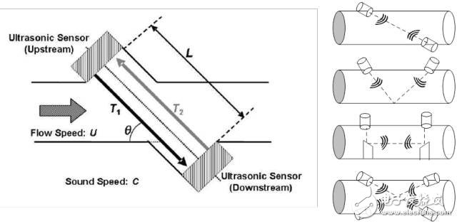 安裝在流管內(nèi)部或外部的一對或多對超聲波傳感器可以用來測量TOF。圖4所示為簡易的超聲波測量原理和一些常見的超聲波傳感器布置撲。超聲波傳感器的選擇取決于待測流體的介質(zhì)類型。通常,待測流體為液體時(shí)使用頻率大于等于1MHz的超聲波傳感器,待測流體為氣體時(shí)使用頻率小于等于500kHz的超聲波傳感器。