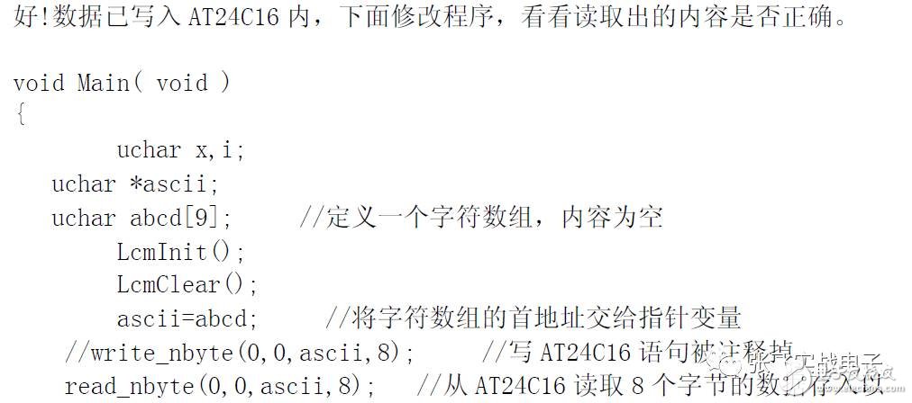 OK,成功!這次"iic test"這行字符是從AT24C16 內(nèi)讀取的。你可以試著拔掉那兩根SDA,SCL 的數(shù)據(jù)線,再按下復(fù)位鍵重新運(yùn)行,你會(huì)發(fā)現(xiàn)那行“iic test”沒(méi)有顯示了。說(shuō)明沒(méi)有讀取到數(shù)據(jù)。再裝上數(shù)據(jù)線,重按復(fù)位鍵運(yùn)行,又正常了。后面就可以將存儲(chǔ)在S51 代碼段的字模,圖形數(shù)據(jù)等,都寫(xiě)到AT24C16 里了。