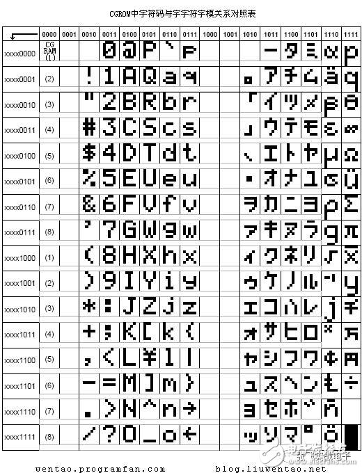 剛才我說(shuō)了想要在LCD1602 屏幕的第一行第一列顯示一個(gè)"A"字,就要向DDRAM 的00H 地址寫(xiě)入“A”字的代碼41H 就行了,可41H 這一個(gè)字節(jié)的代碼如何才能讓LCD 模塊在屏幕的陣點(diǎn)上顯示“A”字呢?同樣,在LCD 模塊上也固化了字模存儲(chǔ)器,這就是CGROM 和CGRAM。HD44780 內(nèi)置了192 個(gè)常用字符的字模,存于字符產(chǎn)生器CGROM(Character Generator ROM)中,另外還有8 個(gè)允許用戶(hù)自定義的字符產(chǎn)生RAM,稱(chēng)為CGRAM(Character Generator RAM)。下圖說(shuō)明了CGROM 和CGRAM 與字符的對(duì)應(yīng)關(guān)系。