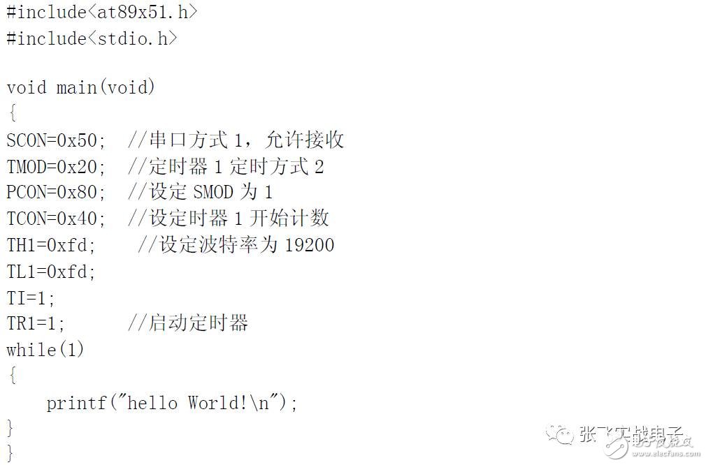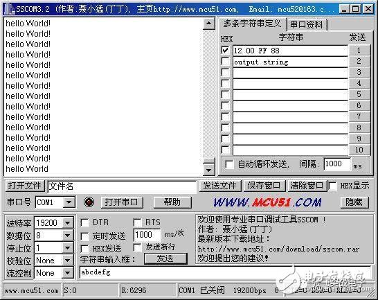 在電腦上將程序?qū)懞?,編譯后用ISP 寫(xiě)入S51。程序很簡(jiǎn)單,就是不停地向PC傳送“hello World!”。程序如下: