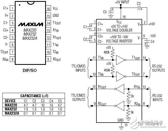 先得搭建個(gè)臨時(shí)電路試一試,MAX232 結(jié)構(gòu)圖和電路圖如下: