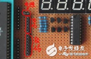 接下來(lái)就是確定電路。電路的接口與AT89S51 間有三組接口:段碼、位碼和電源。為了讓AT89S51 獨(dú)立出來(lái)這三級(jí)接口都采用插針做接口,用排線自由連接到AT89S51 的P1-P3 口,電源用短路帽連接,完成后的板子見(jiàn)下圖: