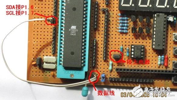現(xiàn)在我們接上電源短路帽把AT24C16 電源接好。將兩個(gè)數(shù)據(jù)線用跳線接到P1.6和P1.7 口上(接到哪個(gè)口上可以自己選的)。注意分清哪個(gè)是SDA 哪個(gè)是SCL。別弄錯(cuò)了。