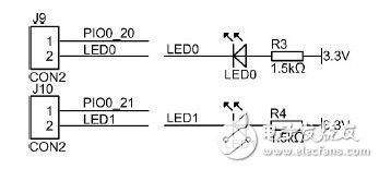 如圖4.6 所示為AM824-Core 板載的2 個LED發(fā)光二極管,與MCU 的I/O 引腳通過J9 和J10 相連,其中的LED0 通過J9 與MCU 的PIO0_20 相連,LED1 通過J10 與MCU 的PIO0_21 相連。當(dāng)I/O 輸出低電平0 時,由于LED 陽極加了3.3V 電壓(高電平1),因而形成了電位差,所以有電流流動,則LED 發(fā)光二極管導(dǎo)通,即LED 發(fā)光;當(dāng)I/O 輸出高電平1 時,由于無法形成電位差,則LED二極管不導(dǎo)通,即LED 熄滅。