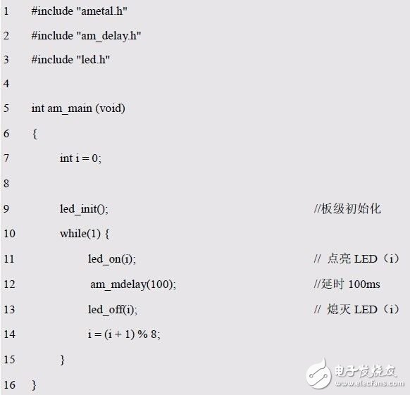 其實LED 不停地閃爍就是讓一個I/O 不斷翻轉(zhuǎn)的過程,而AMetal 軟件包針對LED 提供了翻轉(zhuǎn)LED 狀態(tài)的函數(shù)led_toggle(),優(yōu)化后的代碼詳見程序清單4.5。