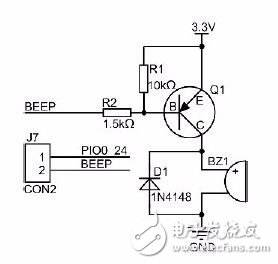 如圖4.9 所示為無源蜂鳴器電路原理圖,只要短接J7_1 與J7_2,則蜂鳴器接入PIO0_24。當(dāng)PIO0_24 輸出低電平時,則三極管導(dǎo)通,向蜂鳴器供電;當(dāng)PIO0_24 輸出高電平時,則三極管截止,停止向蜂鳴器供電。因此只需要輪流切換PIO0_24 的電平狀態(tài),就可以控制蜂鳴器的“通電”和“斷電”,即以一定的頻率翻轉(zhuǎn)PIO0_24 的輸出電平。其實接通和斷開“一段時間”的總和就是蜂鳴器的振蕩周期,再稍作轉(zhuǎn)換就能夠得到確定的音頻脈沖頻率參數(shù)。從而產(chǎn)生機械振動音,只要頻率在人耳聽覺范圍內(nèi),即可聽到蜂鳴器發(fā)聲。