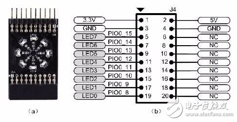 LED 模塊通過MiniPort B(排母)與AM824-Core相連,同時將其余不使用的I/O 通過MiniPort A(排針)引出,實現(xiàn)模塊的橫向堆疊,其對應(yīng)AM824-Core 的MiniPort 接口J4 的功能定義詳見圖4.8。
