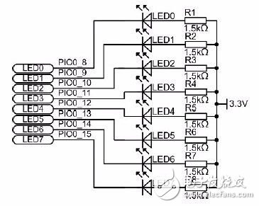MiniPort-LED 模塊集成了8 個LED,均為低電平有效,分別通過PIO0_8~PIO0_15 控制,其中的R1~R8 為LED 的限流電阻,詳見圖4.7。