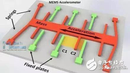 加速度傳感器是最早廣泛應(yīng)用的MEMS之一。MEMS,作為一個機(jī)械結(jié)構(gòu)為主的技術(shù),可以通過設(shè)計使一個部件(圖中橙色部件)相對底座substrate產(chǎn)生位移(這也是絕大部分MEMS的工作原理),這個部件稱為質(zhì)量塊(proof mass)。質(zhì)量塊通過錨anchor,鉸鏈hinge,或彈簧spring與底座連接。