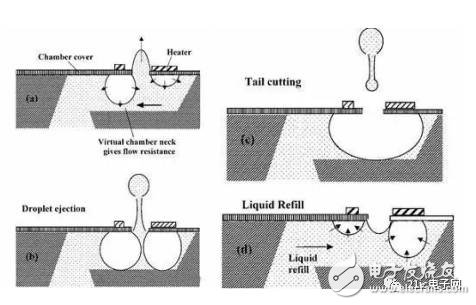 另一種類型MEMS打印噴頭,也是通過加熱,氣泡擴(kuò)大將墨水?dāng)D出: