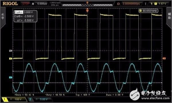 藍(lán)色為用電流互感器測試到的諧振網(wǎng)絡(luò)的電流波。