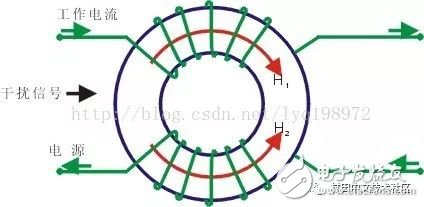 根據(jù)右手螺旋定則,在同一磁環(huán)繞上方向相反的兩個線圈通過極性相同,幅值相等的兩個電壓時,產(chǎn)生的磁通相互疊加,感抗為:Xl=wL,感抗很大。差分信號產(chǎn)生的磁通就相互抵消。