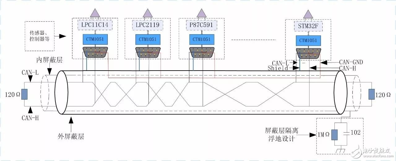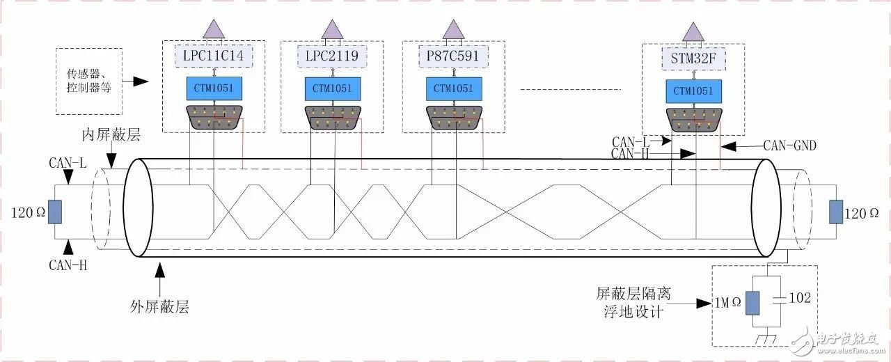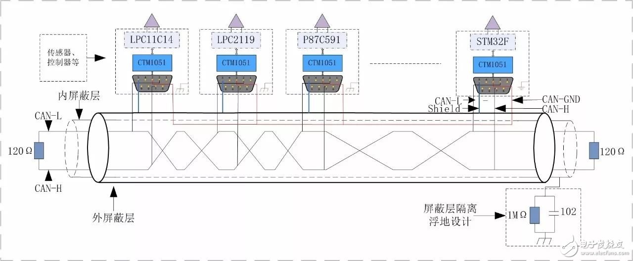 多節(jié)點(diǎn)總線同樣要求屏蔽地采用單點(diǎn)接地,防止形成回路,并且為浮地設(shè)計。